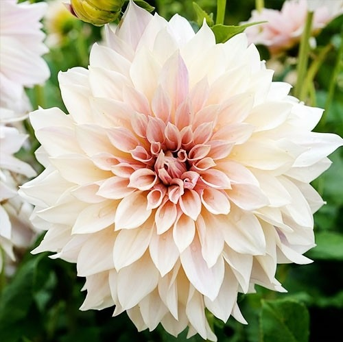 Георгин сорта Кафе О Лейт отличается крупными, махровыми цветками кремового оттенка с легким розовым подтоном в центре. Диаметр цветка составляет 20-22 см. Высокорослый куст достигает высоты до 110 см и отличается пышностью. Период цветения продолжается с июля по сентябрь, при этом цветы имеют слабый аромат. Этот сорт идеально подходит для срезки и обладает высокой устойчивостью к болезням и вредителям.